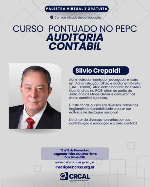 De 15 a 18 de dezembro, o CRCAL promove o Curso de Auditoria Contábil com o professor Silvio Crepaldi, profissional reconhecido pela atuação técnica, pela docência e por suas contribuições ao Judiciário e ao meio acadêmico.